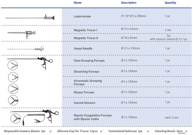 | Laparoscope | 0°/ 30° Ø 5 x 290mm | 1 pc |