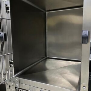 Συστοιχία κατασκευασμένη από ανοξείδωτο ατσάλι τύπου 304, μέγιστης σκληρότητας και αντοχής. Όλα τα κλουβιά της συστοιχίας έχουν στρογγυλεμένα άκρα στο εσωτερικό τους ώστε να μπορούν να καθαρίζονται εύκολα και – το κυριότερο – αποτελεσματικά καθώς τα συμπαγή τοιχώματα και η απουσία γωνιώσεων στο εσωτερικό τους, δεν επιτρέπει τον εγκλωβισμό και την αναπαραγωγή μικροοργανισμών, εξασφαλίζοντας ένα ασφαλέστερο και πιο υγιεινό περιβάλλον αφού είναι εύκολο να διατηρηθεί ο χώρος νοσηλείας αποστειρωμένος και καθαρός.