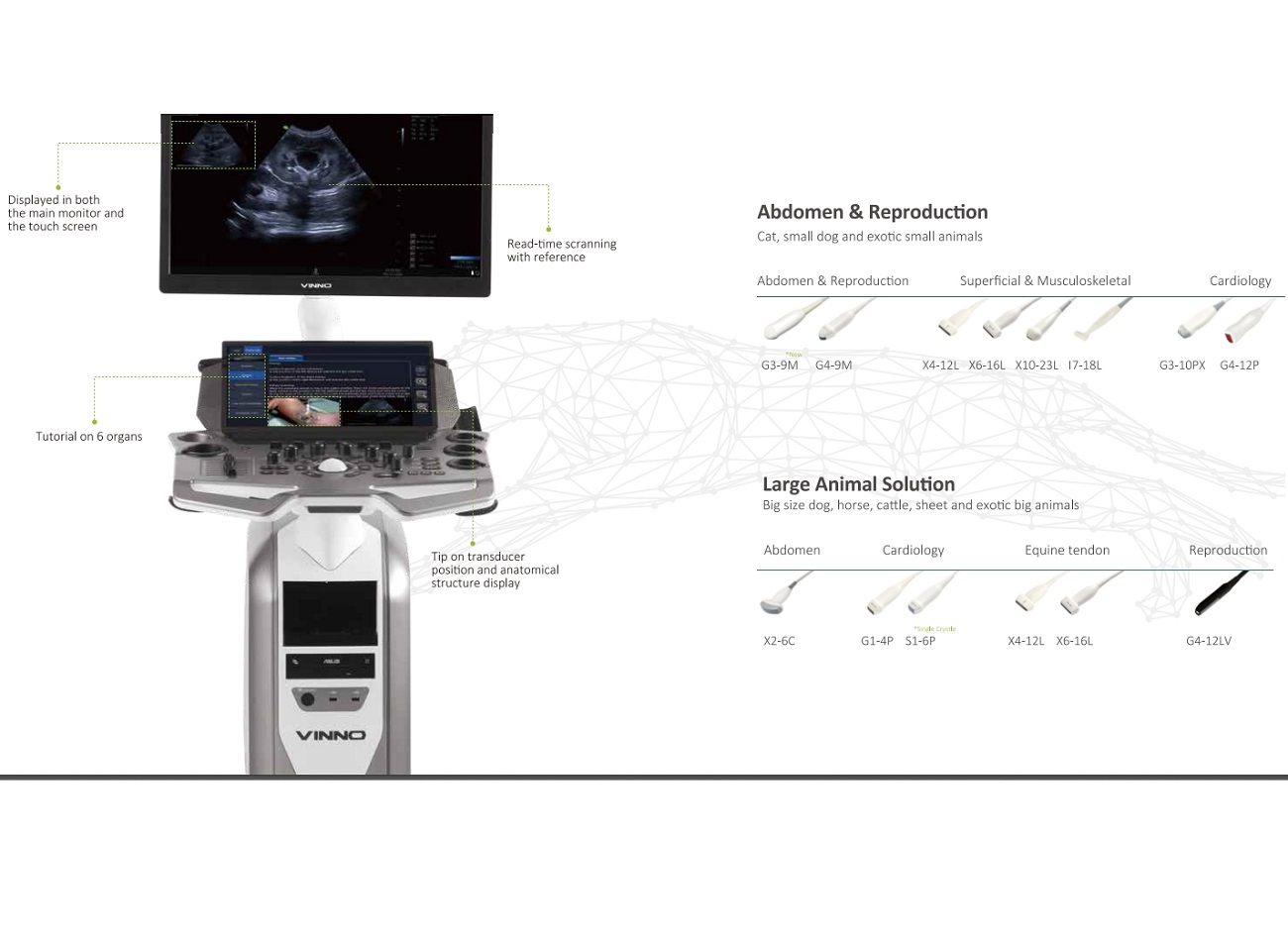 Το Vinno R700 Vet είναι ένα καινοτόμο φορητό σύστημα υπερήχων, σχεδιασμένο ειδικά για κτηνιατρική διάγνωση. Με την αιχμή της τεχνολογίας και την ενσωμάτωση πρωτοποριακών χαρακτηριστικών, το Vinno R700 παρέχει κορυφαία ποιότητα εικόνας και ακρίβεια στις διαγνωστικές εξετάσεις ζώων.