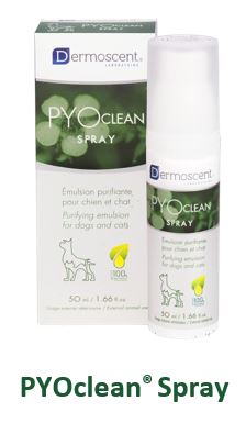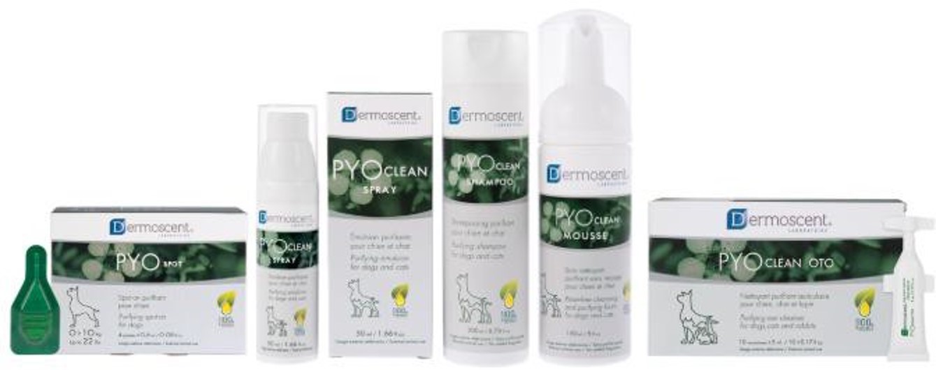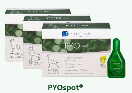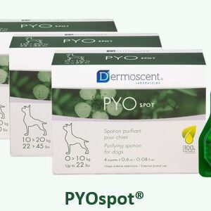 PYOspot: Μια μοναδική θεραπεία “spot-on” που εφαρμόζεται εβδομαδιαίως σε ένα μόνο σημείο του δέρματος του κατοικίδιου ζώου. Χρησιμοποιεί έναν βιοδιαχυτικό παράγοντα για να απλώσει τα καθαριστικά συστατικά σε όλο το σώμα για τη διαχείριση των γενικευμένων ανισορροπιών του δέρματος.