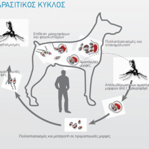 Όταν η σκνίπα τσιμπήσει ένα μολυσμένο ζώο, θα ενοφθαλμίσει τις αμαστίγωτες μορφές οι οποίες μέσα σε 24 ώρες θα μετατραπούν σε προμαστιγωτές μορφές. Οι τελευταίες, με ένα δεύτερο τσίμπημα, θα μεταφερθούν σε ένα άλλο ζώο και θα εγκατασταθούν στο δέρμα και στο αίμα. Μετά από περίοδο επώασης 3 μηνών έως 2-3 ετών, θα μεταναστεύσουν και θα προσβάλλουν διάφορα όργανα. - Για οδηγίες χρήσης του τέστ πατήστε εδώ